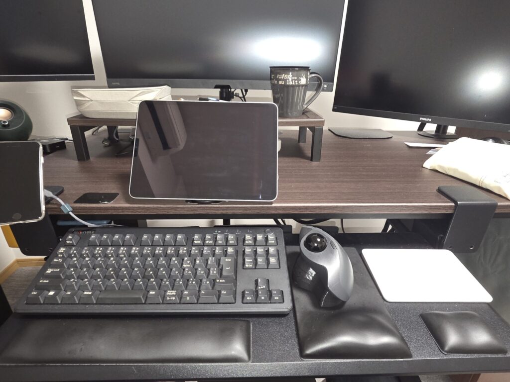 私のデスク環境は、奥行き66cmの机に31.5インチモニターや34インチウルトラワイドモニターを設置しているため、適切な視距離を確保するとキーボードを置くスペースが極端に限られてしまいます。