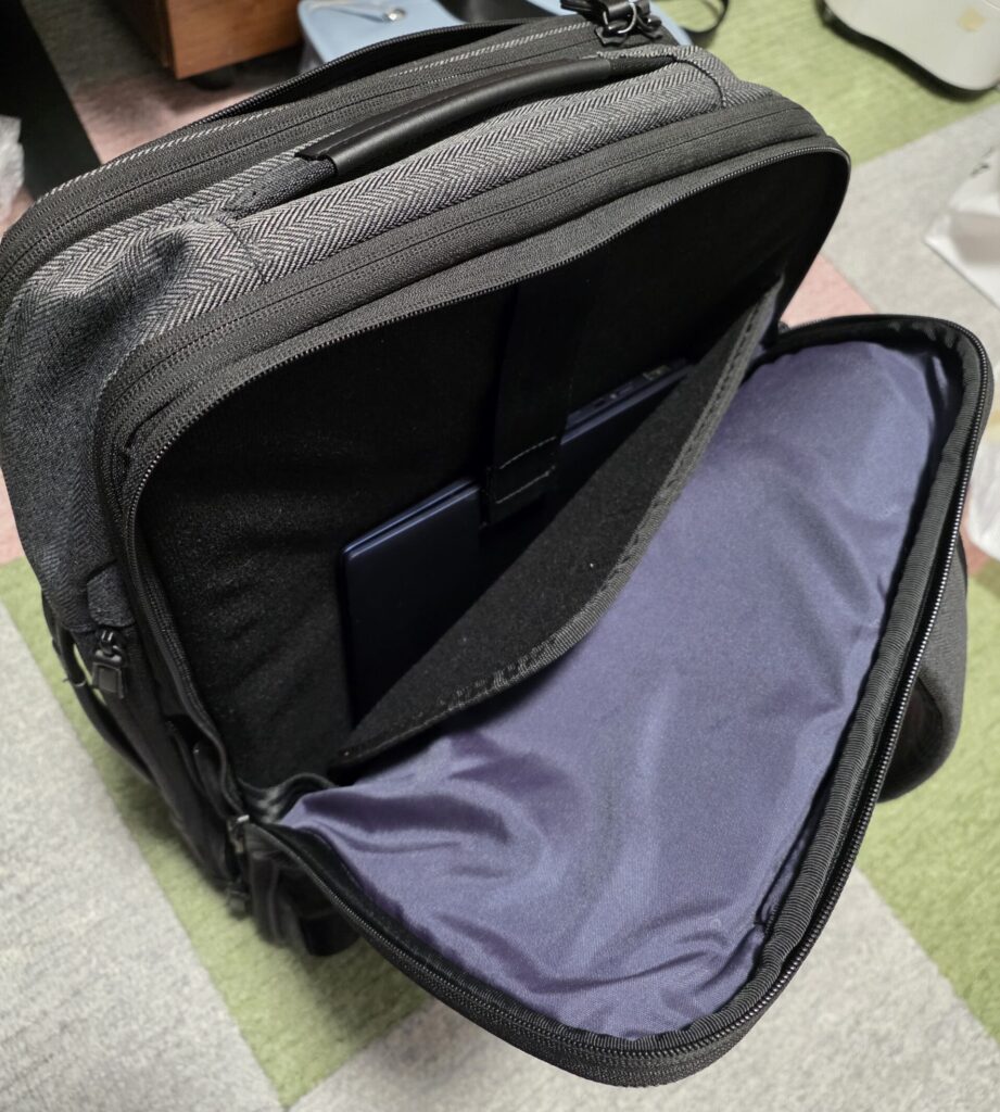 柔らかいパイル生地で保護されたPC専用収納が独立しています。仕事で外出する際は必ずPCを持っていくため、この機能は必須でした。実際に使ってみると、柔らかい生地がPCを優しく包み込み、安心して持ち運べます。