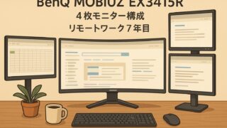 ガジェット・ツール リモートワーク7年目の4枚モニター構成|BenQ EX3415R徹底レビュー リモートワーク7年間の集大成!4枚モニター環境でメイン機として2年間使用したBenQ MOBIUZ EX3415Rの詳細レビュー。34インチウルトラワイドの実用性と複数PC切替の活用術を公開 2025.09.21 ガジェット・ツール