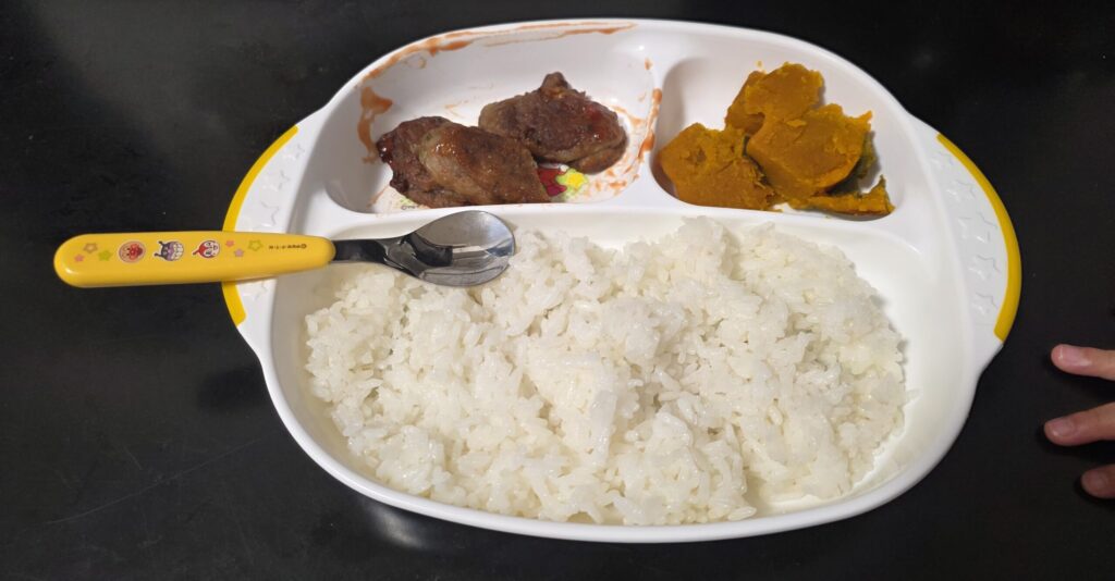 少し前まではスプーンを頑張って使おうとしながら食べていたのに、最近は急に手づかみで食べようとするようになったのです。
