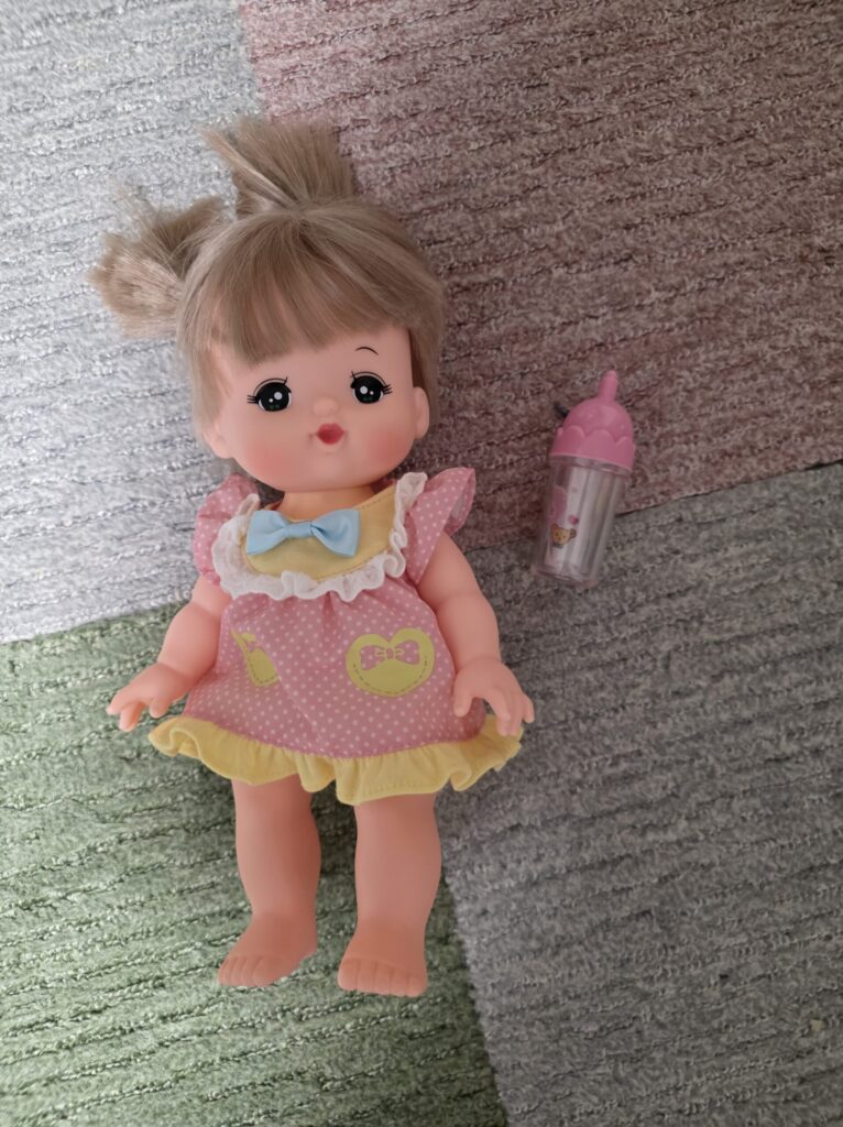 - セット内容: メルちゃん本体、ワンピース1着、おむつ、ミルクびん、ブラシ、おせわてちょう