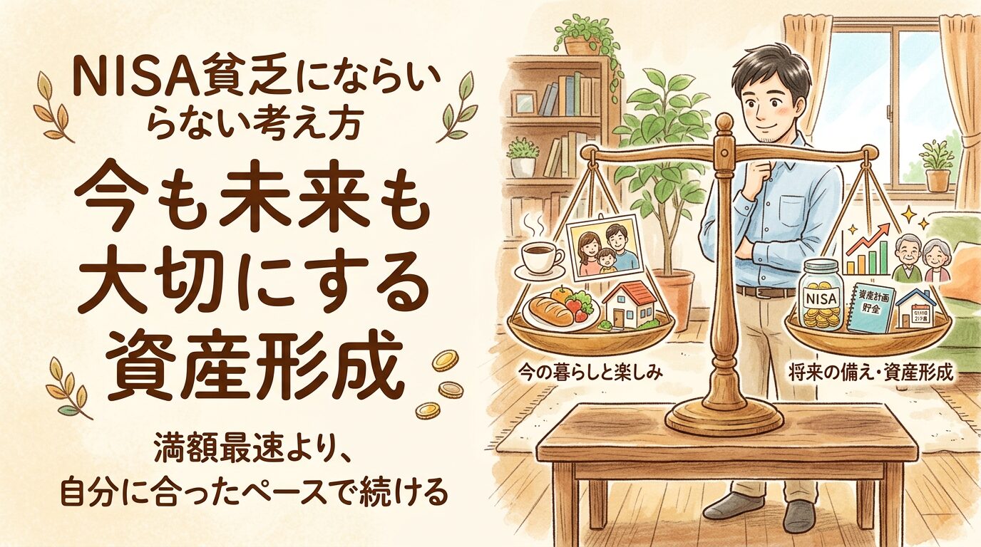 この記事では、「NISA貧乏」がなぜ起きるのかを整理したうえで、必要額の逆算、今と未来のバランス、定期的な見直し、収入アップという選択肢まで含めて、私なりの考えをまとめます。NISAを頑張ること自体が目的になって苦しくなっている方にこそ、読んでほしい内容です。