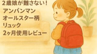 育児グッズ 2歳の娘が離さない!アンパンマンオールスター柄リュック2ヶ月使用レビュー 大人のリュックを背負いたがる2歳娘に専用リュックを購入。アンパンマンオールスター柄リュック2ヶ月使用の正直レビュー。キャラクター探し遊びで想定外の教育効果も。 2025.10.16 育児グッズ