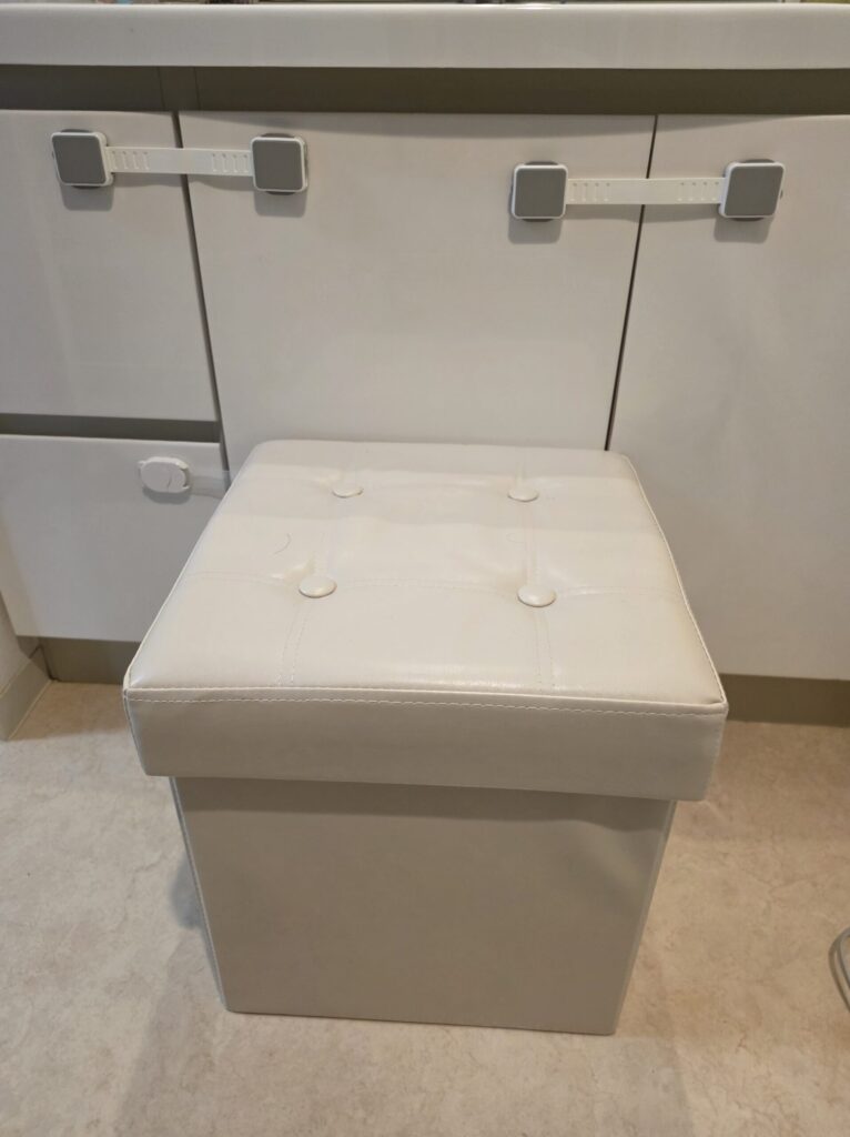 床材との相性 タイル床の上では滑りやすく、子どもが乗る際にスツール自体が動いてしまうリスクがあります。我が家では滑り止めシートを底面に貼って対策しています。